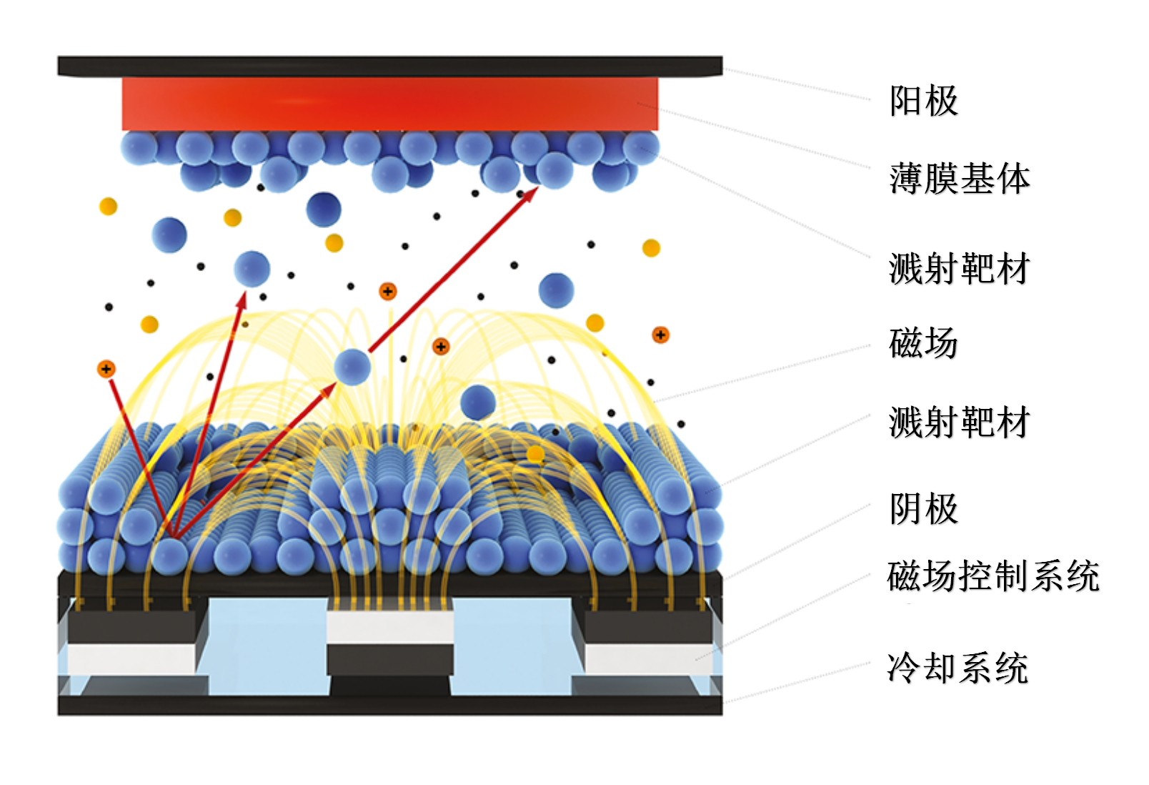 磁控濺射鍍膜工藝是指將涂層材料做為靶陰極,利用氬離子轟擊靶材,產(chǎn)生陰極濺射,把靶材原子濺射到工件上形成沉積層的一種鍍膜技術(shù)。