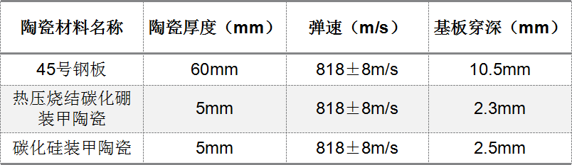 不同陶瓷裝甲的抗彈性能試驗結果如下表: