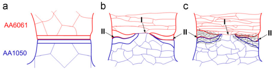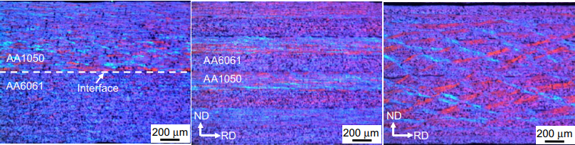 而su[2]等學者研究發現退火處理后的AA1050/AA6061板材經過累積軋制的超細晶多層復合材料在不同道次下界面會呈現不同特征,初始三個道次內,不同鋁合金母材基本上能夠同步協調變形,但是當軋制次數變多時,AA6061界面就會發生頸縮,斷裂,最終發生界面紊亂。
