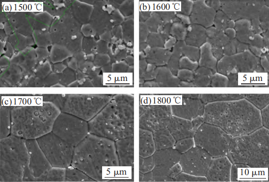 從圖中可以明顯看到,燒結溫度為1500℃時,平均晶粒大小為3.34um,此時致密度較低,晶粒之間存在明顯的空隙,燒結效果并不理想;當燒結溫度為1600℃時,晶粒大小為3.74um,可以看出合金的晶粒大小并沒有明顯長大,但是致密性卻有明顯的改善;當燒結溫度為1700℃、1800℃時,晶粒明顯長大,約9.5um。