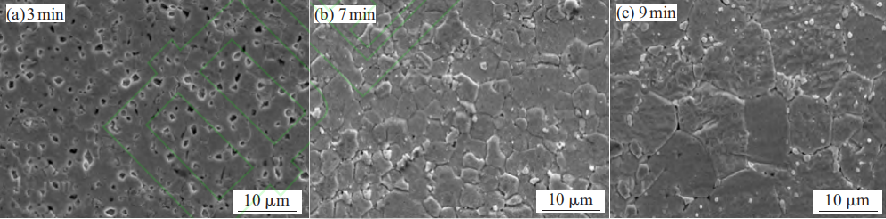從上圖(a)可以看出,保溫時間較短時,粉末坯存在明顯的燒結頸,隨著保溫時間的增加,燒結頸消失,孔隙閉合,致密度有明顯增加,并且此時晶粒尺寸沒有明顯長大,如圖(b),之后再進行保溫,可以看出晶粒明顯長大如圖(c)。