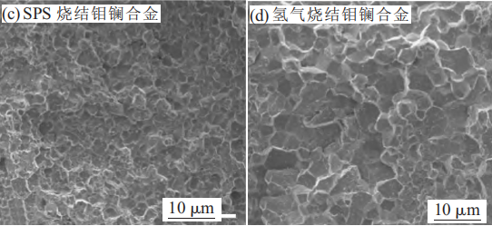 通過對SPS燒結(溫度1600℃、保溫7min)及氫氣保護燒結(1800℃,保溫6h)合金進行抗拉強度和抗壓強度測試,發現采用SPS燒結的鉬鑭合金抗拉強度以及抗壓強度分別提升765MPa、2307MPa。對兩種試樣的斷口分析發現SPS燒結的合金晶粒大小更加均勻細小。